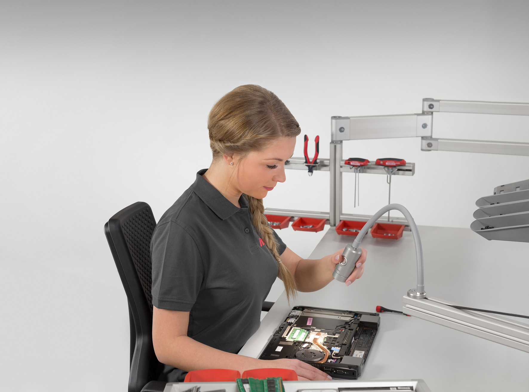 Underestimated but oh-so important – lighting is often neglected when it comes to developing the perfect design for an industrial work bench. This is surprising because ideal lighting conditions have been proven to benefit employees’ concentration levels, reduce error rates and ultimately increase productivity. Selecting suitable LED light fittings offers ergonomic advantages, too. By taking a few fundamental aspects into consideration, companies can enjoy the efficiency-boosting benefits of LED technology.